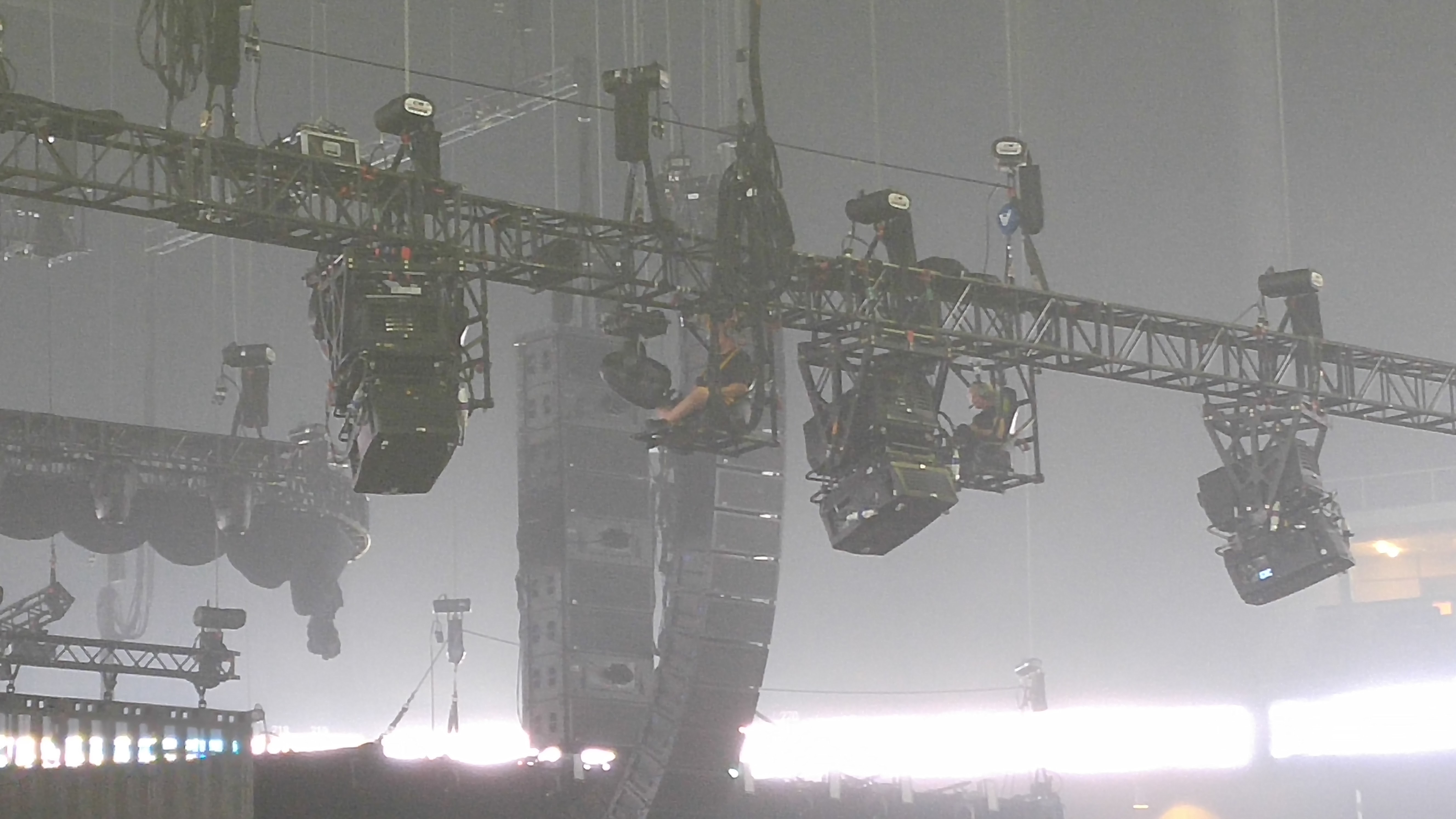 - People positioned up in the lighting bars. After Mike Posner a middle section of lights came down and three people crawled up into some harness looking seats to operate spot lights. The lights then went backup and those folks sat in those seats for the duration of the night (nearly 3 hours). [caption id="attachment_91" align="aligncenter" width="300"]