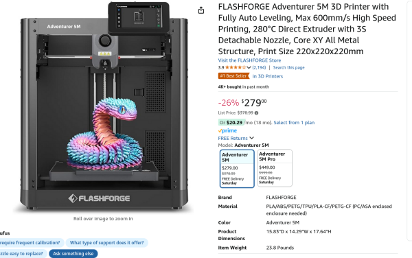 I landed on the Flashforge Adventurer 5M, mostly because the price was $280 on Amazon and for the most part people seem to be impressed, I figured it couldn't be worse than my previous printer that shall not be named.