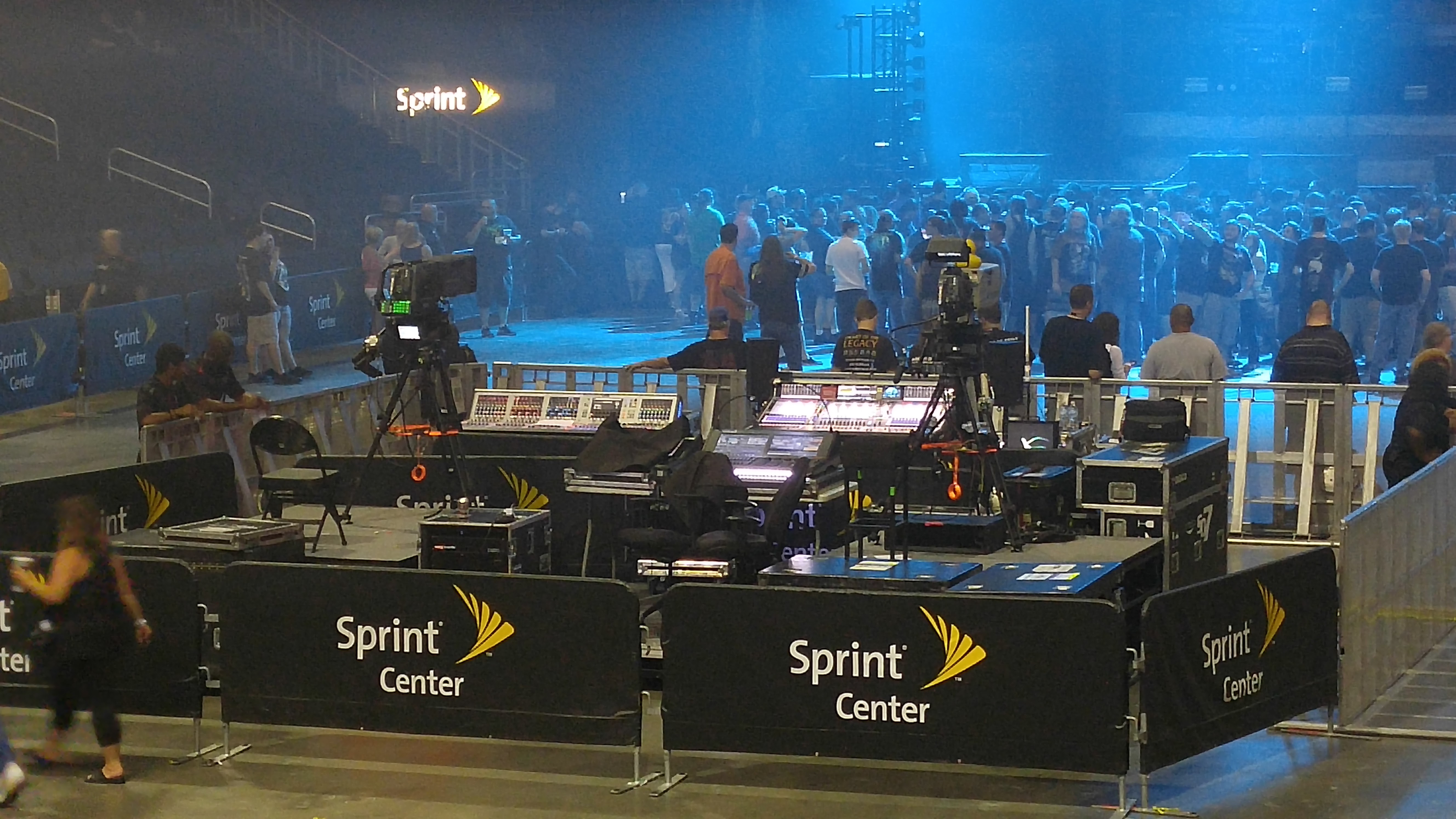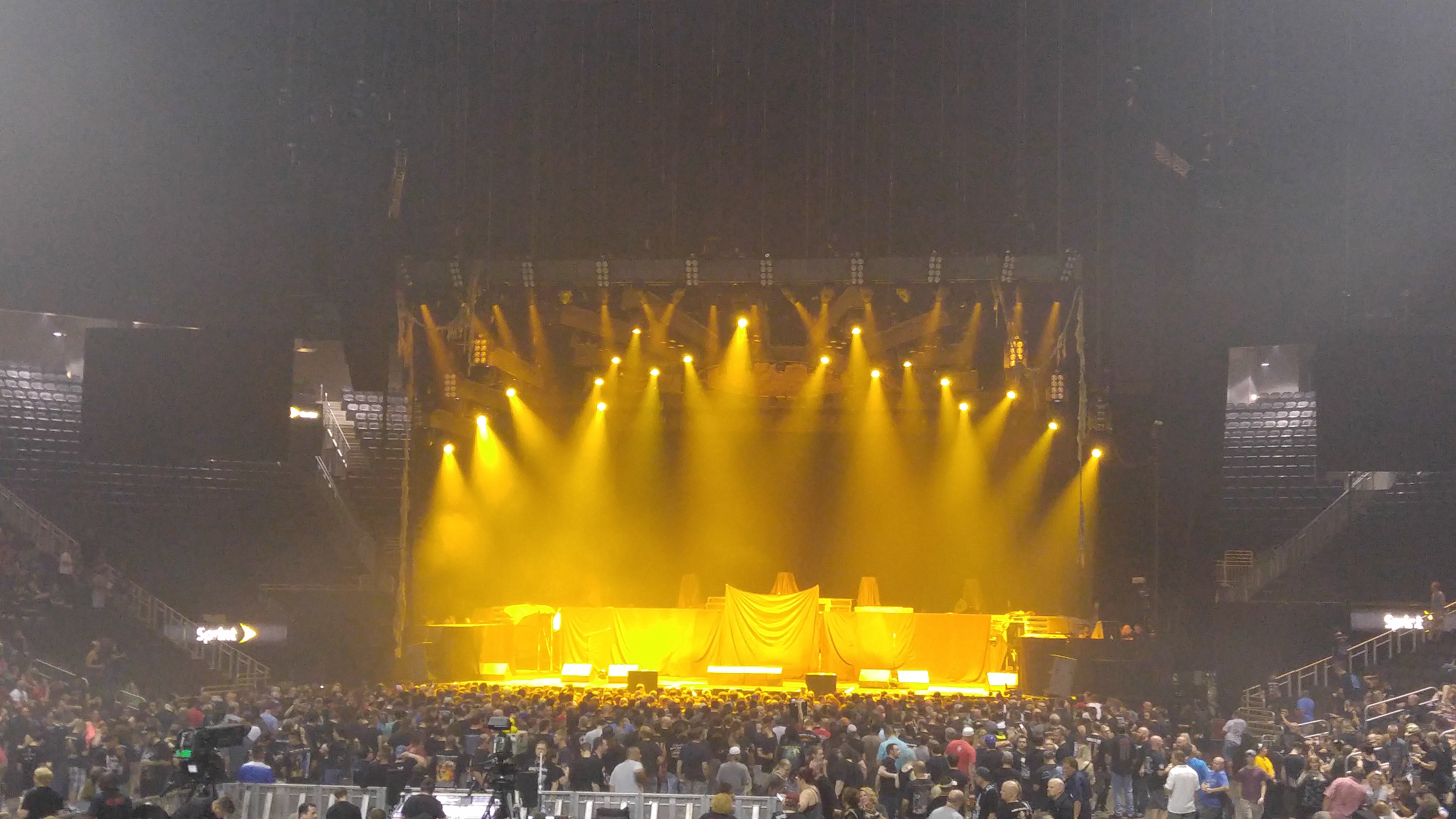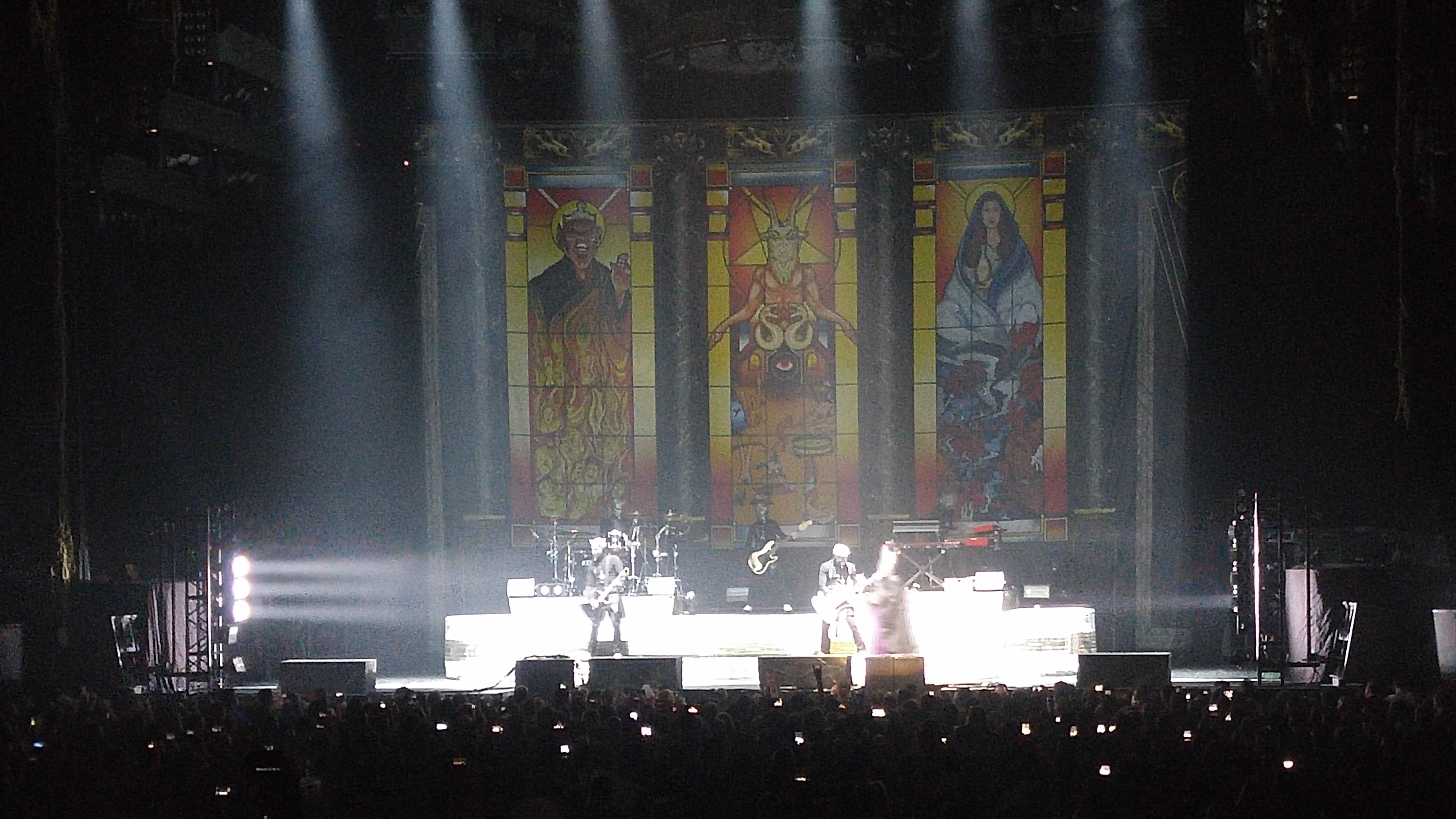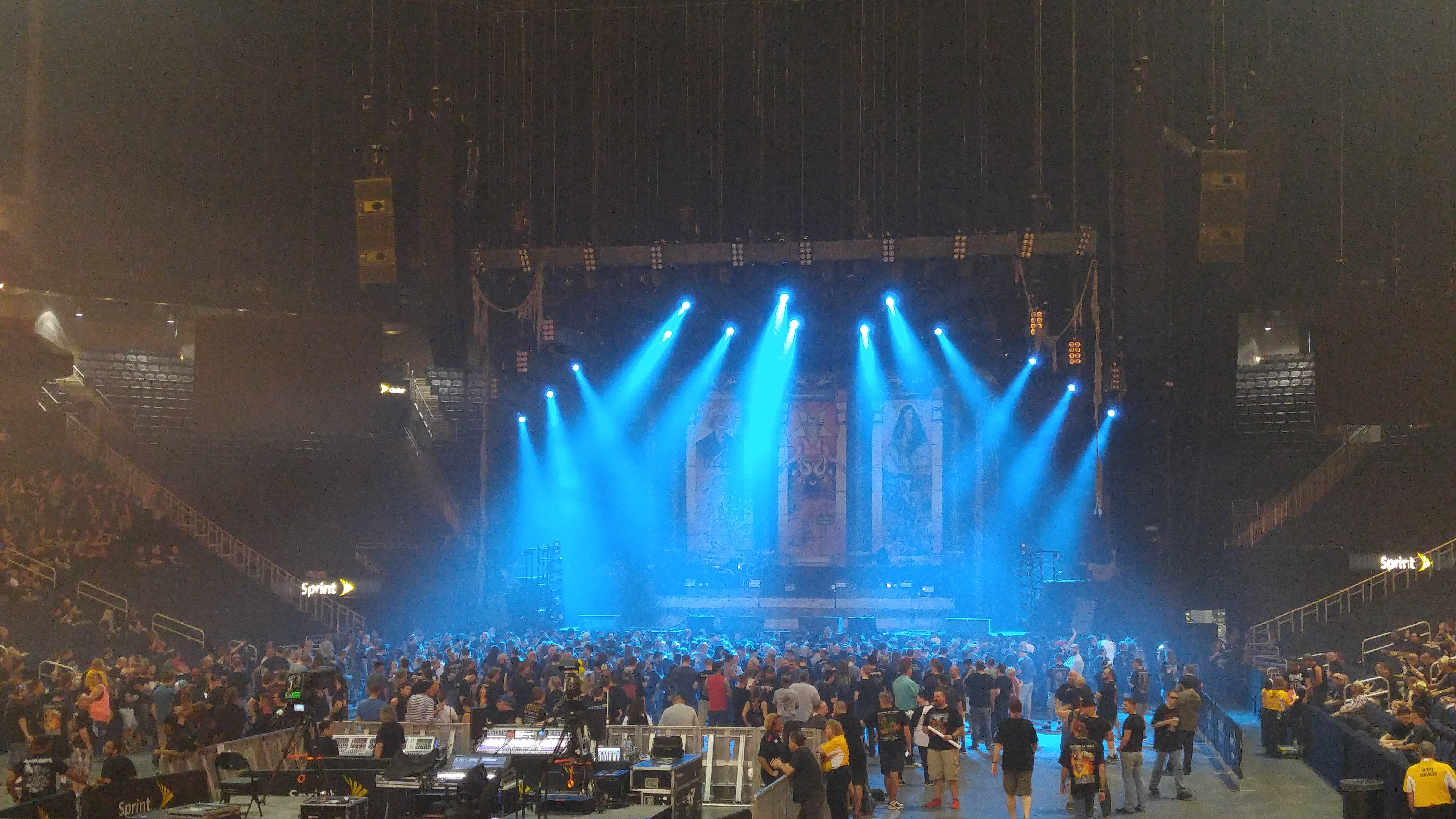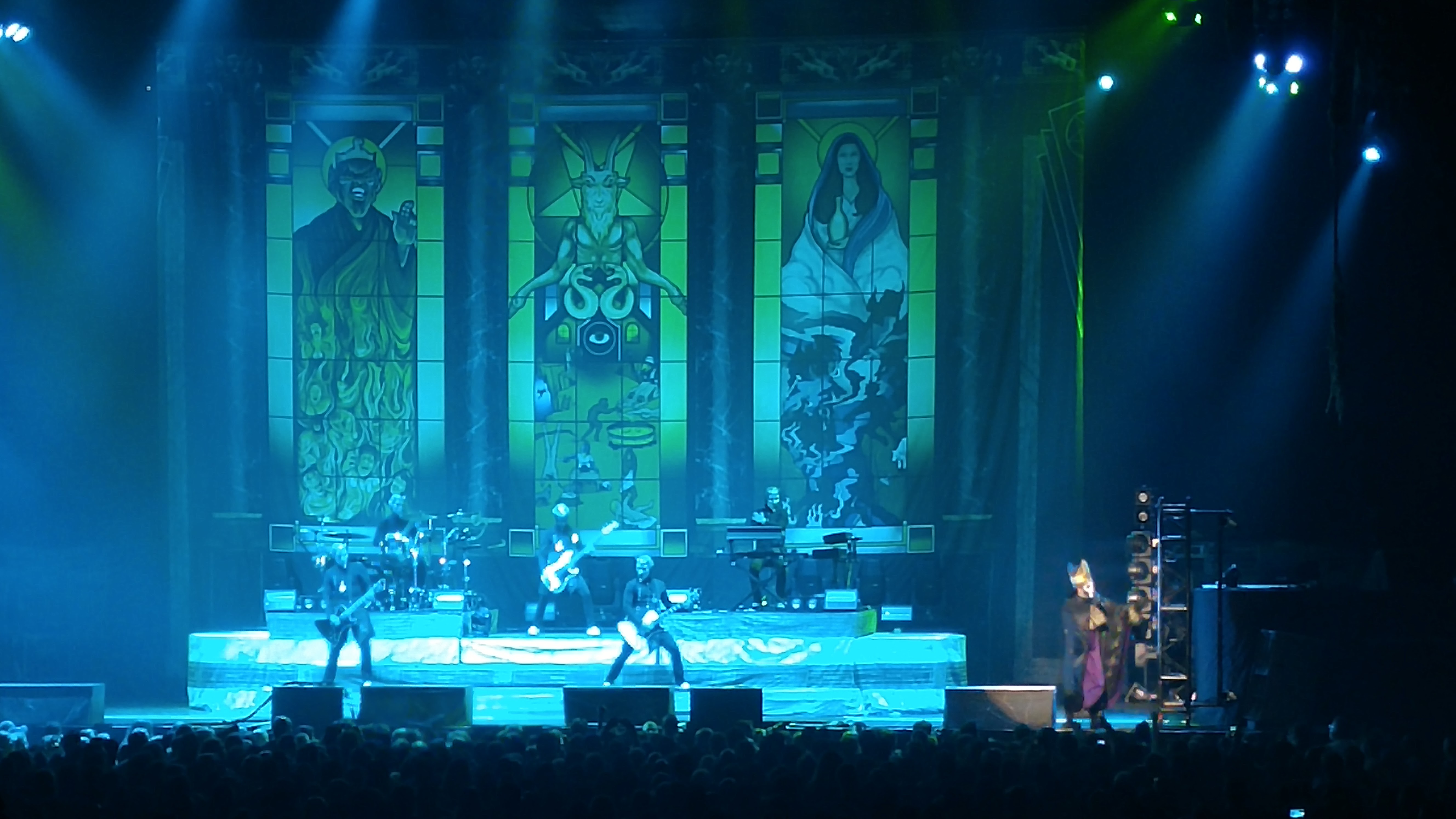 There are few bands for me that are on the same level as Iron Maiden. The songs, the lore, the musicians, the routine onstage shooting fire columns, the longevity, the theatrical performances, and Bruce Dickinson. Angie, Sam and I picked up these tickets within minutes of them going on sale with neither of them having any idea who this opening act "Ghost" was. I, of course, knew who Ghost was and knew it was going to be an interesting evening watching those guys do what they do. No-one however mentioned to us that one of these bands seemingly have a problem with Air Conditioning. They requested the Sprint Center be no cooler than 83°. Sure doesn't sound horrible, but this is inside with no air movement. It got sticky quickly. Anyhow Ghost was setup first and had some expected Satanic imagery on their graphics: